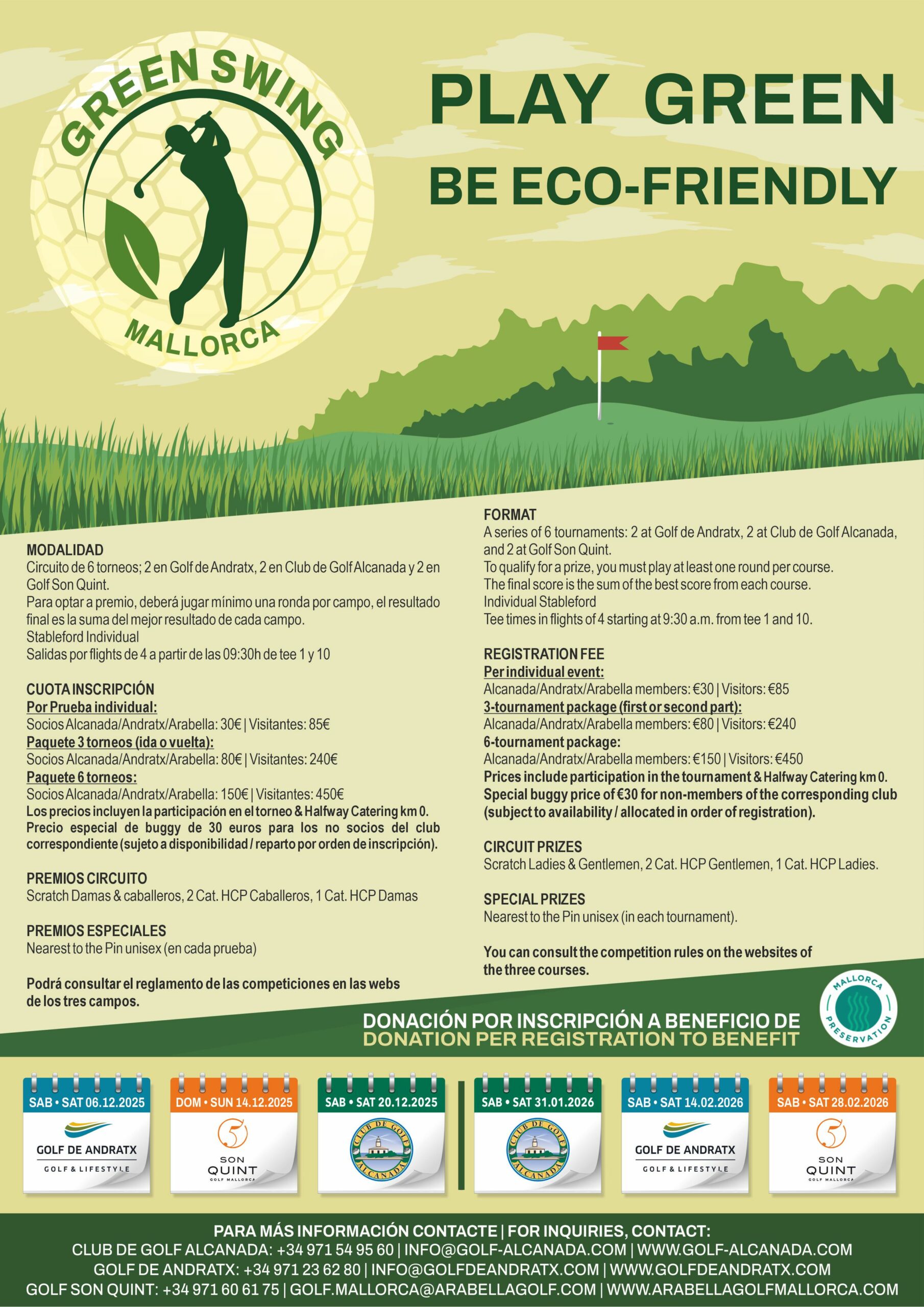 Nous sommes ravis d’annoncer le lancement du Green Swing Mallorca Circuit 2025–2026, une série qui allie compétition, expériences premium et un engagement ferme en faveur de la durabilité. Le deuxième tournoi aura lieu à Golf Son Quint le dimanche 14 décembre 2025.